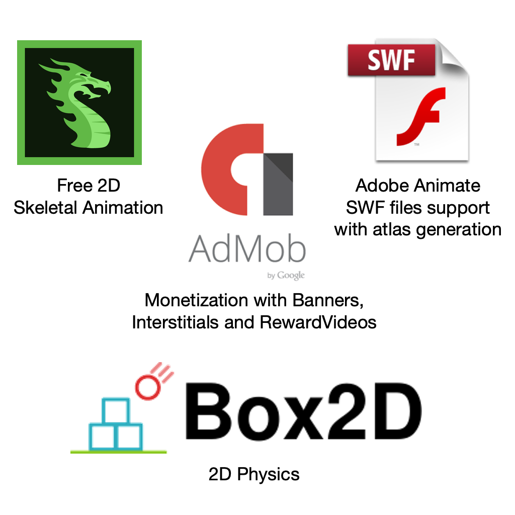 Also, it is extensible and include several plugins out of the box: DragonBones, Box2D, SWF and Admob. And more coming.